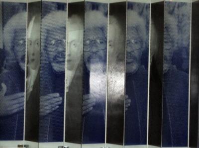 Halbtransparente, fächerförmige Glasskulptur von Hannes Arnold und Klaus-Dieter Eichler im Senatssaal der Universität Bayreuth. Sie zeigt je nach Blickwinkel die Portraits Wole Soyinkas sowie von Jean Paul.