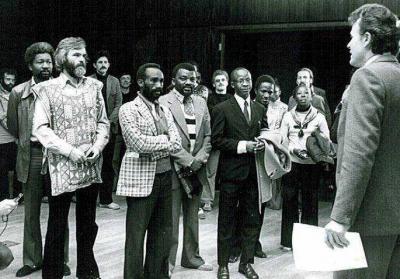 Schriftsteller (ganz links Wole Soyinka) mit OB Dietmar Hahlweg in Erlangen 1980