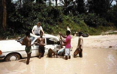 1983 fahre ich mit Feund Yemis Daimler (das aber ist ne ganz andere ARD-Story…) von Lagos über Cotonou, Lome, Accra, Abidjan, Man bis… na, irgendwo in Liberia. Fahre mich also fest oder floate mittem im Wald: Regenzeit. Irgendwann kommt ein einsamer Mensch daher gewandert, sieht mich, bedauert mich. Er werde Helfer suchen gehen. Nach zwei Stunden kommt er tatsächlich mit Helfern zurück. Die buddeln. Und dann frage ich den Dorfschullehrer – das war er – was das denn ‚mache’ ?