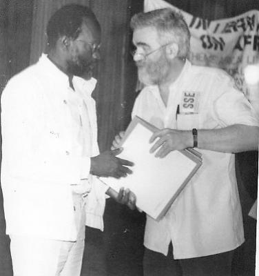 Ich übergebe Kole Omotoso die ersten 15 Bänder mit Portraits afrikanischer Autoren